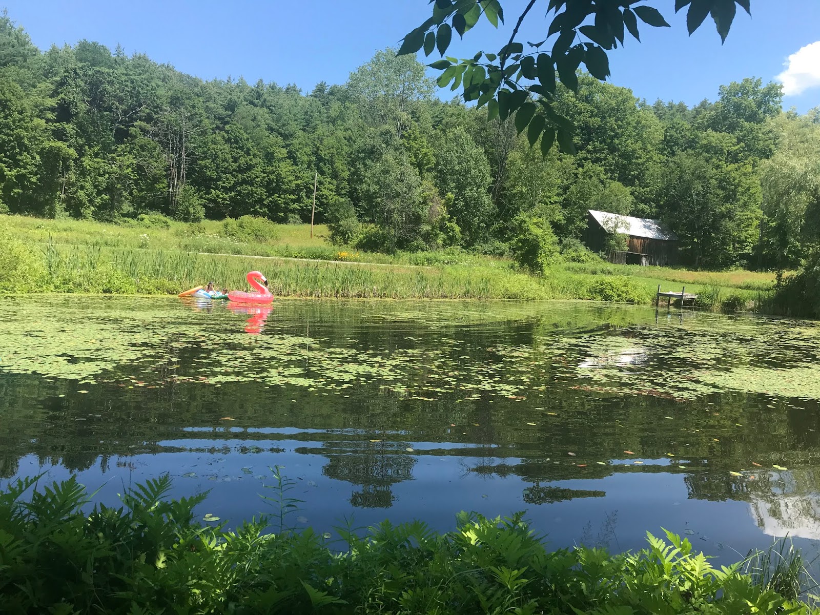 We went to the pond in the late morning. I floated on the raft and the kids played maniacally with their various floats. They really treat the pond as a giant swimming pool, even swimming underwater with their goggles. You have to understand: the pond is untouched, untended, fully wild. It's not a charming, decorative pond with a nice cement bottom. No. It is mush: step in, and you'll sink up to your ankles. There are critters everywhere. Frogs, fish, tadpoles, salamanders, dragonflies, and the snapping turtle (somewhere). There are lily pads with long, slimy stalks. There is algae. There are large nests of other kinds of algae. There are cattails. Even after many summers of the kids enjoying the pond, I'm still surprised at how all-in they are. One of their favorite things to do is balance on this log that's been floating in the pond since last year--they call it Al, and it is just...hideously rotting and slimy. Yet they stand on it, sit on it. I privately shudder. They say they like the pond even more than swimming in a pool. On this, my children are wrong, very very wrong, because touching the pond and feeling algae weave through my fingers is terrible, and swimming in a cool, clean, clear pool is bliss.